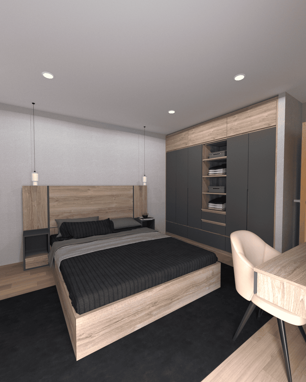 Este proyecto de diseño de interiores fue concebido a partir de una paleta de tonos neutros, anclada en la serenidad de la madera clara, el blanco y los sofisticados grises y negros. Esta selección cromática confiere a todo el espacio una atmósfera de atemporalidad y elegancia moderna.La cocina y las soluciones de almacenamiento, diseñadas a medida, son el corazón de este concepto. El mobiliario de la cocina, que conjuga la textura de la madera con el blanco y el negro, y la inclusión de un llamativo pavimento hidráulico, equilibra estética y funcionalidad. Los armarios de las habitaciones y el mueble de entrada demuestran una búsqueda de almacenamiento inteligente, uniendo compartimentos cerrados, estanterías abiertas y el uso cohesivo de materiales (madera clara y paneles lisos en tonos gris/crema).Además de los elementos de carpintería, el proyecto fue complementado con piezas de mobiliario y decorativas cuidadosamente seleccionadas — desde la moderna mesa de comedor y sus sillas, al mueble de entrada funcional, y a los detalles en las habitaciones (cabeceros, espejos, arte e iluminación) — garantizando un lenguaje de diseño coherente y armonioso en toda la vivienda.El resultado es un conjunto equilibrado que destaca por el confort, el diseño contemporáneo y la máxima funcionalidad, creando un hogar pensado para acoger y facilitar el día a día, con un toque de sofisticación. Materiais